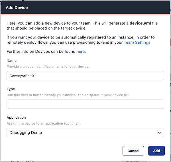 To start editing flows on a device, it needs to be assigned to an application in your team. Up until now this has been a two step process; creating the device and then assigning it. This wasn't as intuitive as it needed to be.